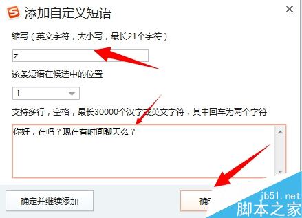 第四步:打開【添加新定義】,輸入簡短字母和需要設(shè)置的快捷語句,最后【確定】即可,如果想一次性添加多個(gè),只需點(diǎn)擊【確定并繼續(xù)添加】即可,如下圖所示: