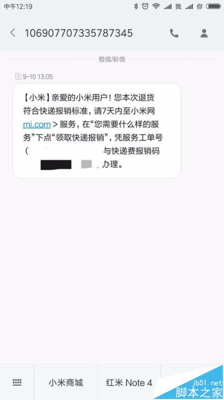 3、如果退貨成功,小米會給你發(fā)送一條信息。這個是退貨成功信息,里面包含了處理單號和退貨報銷號碼。