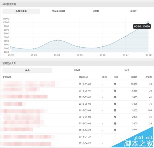 3、查詢之后,進(jìn)入數(shù)據(jù)顯示頁面,在此頁面,我們可以清晰的看到此微信公眾號的歷史最高閱讀量、最高點(diǎn)贊量,平均閱讀量和平均點(diǎn)贊量。另外還有公眾號的發(fā)布周期都一目了然。