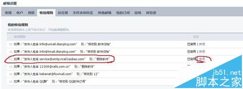 3、在“收件規則”頁面中找到【如果:"發件人包含 12306@rails.com.cn" 則:"刪除郵件"】規則后,點擊“關閉”。