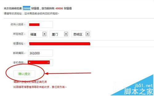 6、進(jìn)入到收禮品的信息填寫頁面,填好我們的地址和聯(lián)系方式,然后確認(rèn)沒有問題的話,點(diǎn)擊確認(rèn)提交。然后等待禮品郵寄過來簽收下就可以拿到錢包了。