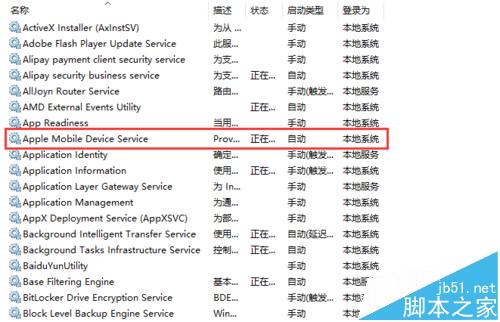 5、這時,我們將可以看到所有的服務欄目下的應用列表,找到一個名為“Apple Mobile Device Service”的欄目,雙擊打開