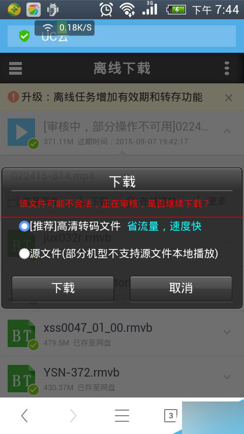 2、不保證所有資源轉存成功,失敗的可選擇源文件地址,或把轉碼的地址復制uc離線重新下載,再選擇文件下載,獲取新的下載地址。