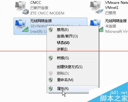 3、在打開的窗口里,選中正在使用的無線網卡圖標,點擊右鍵,選擇“屬性”。