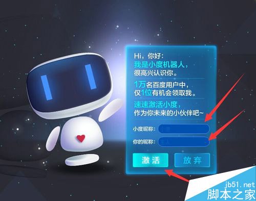 之后就百小度機器人就出現了,填寫TA的昵稱,和你讓TA叫你什么的昵稱,點擊“激活”就領養成功了。