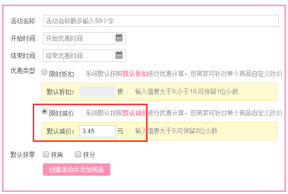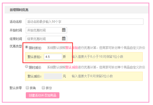 4)優(yōu)惠類(lèi)型,選擇限時(shí)折扣,填寫(xiě)默認(rèn)折扣值(此處默認(rèn)值添加之后,添加活動(dòng)商品會(huì)按照此默認(rèn)折扣進(jìn)行折價(jià),但商家可以靈活針對(duì)每個(gè)商品設(shè)置不同折扣);