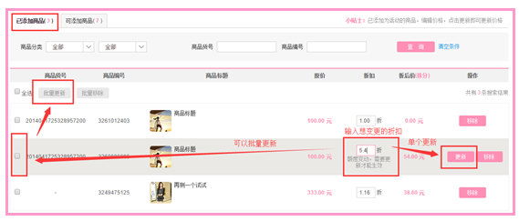 3)變更要更改的商品折扣,修改完畢之后,點(diǎn)擊“更新”或者勾選后“批量更新”即可保存成功;