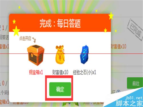 12、系統提醒你完成每日答題所得到的獎勵有一個銅寶箱,10個財富值,一個經驗之石,點下確定就存入我的物品里了。