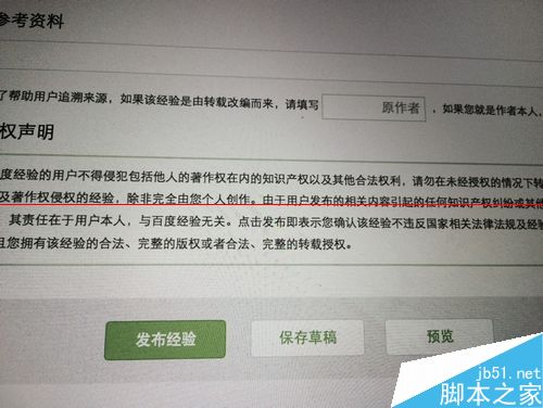 7、最后,一定別忘了在原創作者聲明那里打勾,沒打勾的話,這篇經驗就白寫了。寫完最好預覽一遍,然后點擊發布就可以了。不想馬上發布的就點擊保存草稿,下次從草稿箱里找到這篇經驗點擊編輯就可以發布了