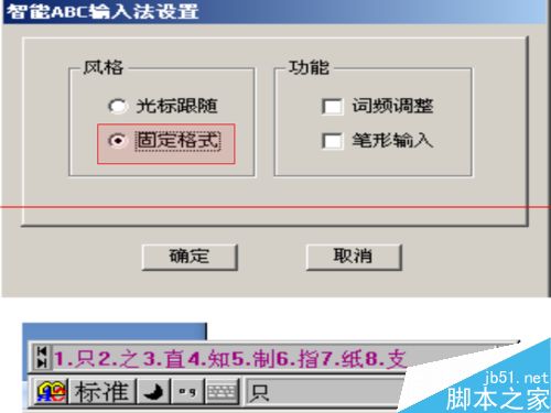 選中固定格式,文字選擇欄在輸入法狀態(tài)欄上方顯示。熟悉輸入法文字排序可以用這種顯示方式。
