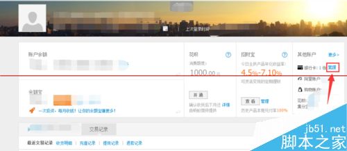 進入支付寶的首頁,在頁面中的右邊找到“其他賬戶”,在它的下方有“銀行卡”,在其旁邊點擊“管理”,如下圖所示