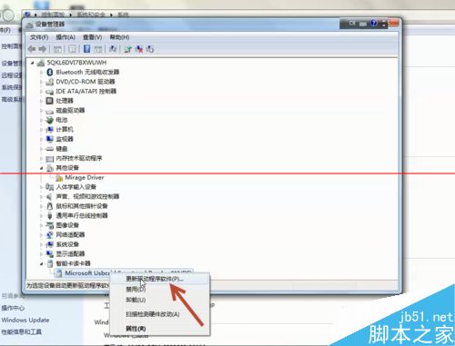 3、在智能選項卡上,單擊鼠標右鍵,然后點擊更新驅動程序軟件。更新完成后就可以正常使用建行U盾了。