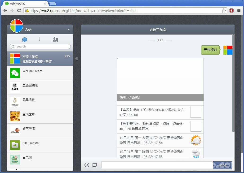 而瀏覽器中將會出現和手機版微信的界面,雙擊打開需要調試的公眾賬號,發送相應的關鍵字進行測試即可。如下所示