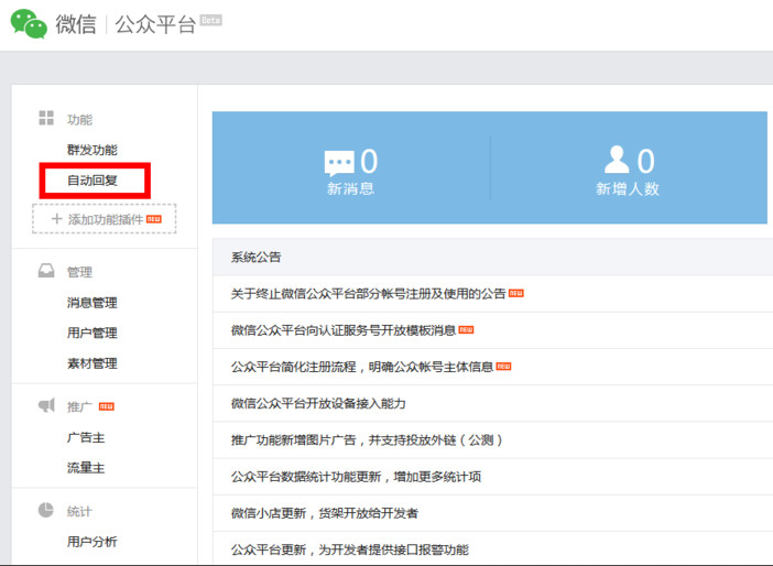 步驟七:登錄訂閱號(hào)后,找到并點(diǎn)擊“自動(dòng)回復(fù)”功能;