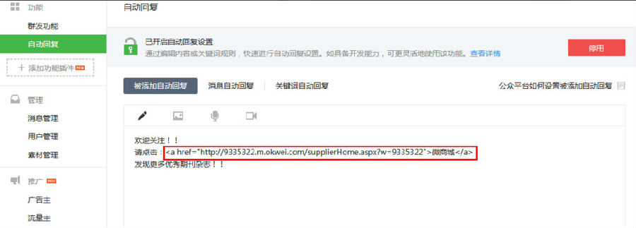 步驟九:在“消息自動(dòng)回復(fù)”一欄也可以填入上步驟的連接;其他文字都可以修改,加上自己的產(chǎn)品廣告語宣傳更有效果;