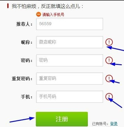 步驟四:推薦人填寫 56559 以及填寫其他相關(guān)信息注冊(cè)賬號(hào);保存好微店號(hào),接下來會(huì)用到的