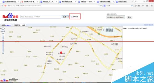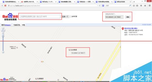 第二步:在輸入框里輸入你需要查找經(jīng)緯度的地址,然后用鼠標(biāo)點(diǎn)擊你要找的地方,這時(shí)右上角的輸入框中就會(huì)出現(xiàn)經(jīng)緯度,當(dāng)然你的鼠標(biāo)也會(huì)顯示經(jīng)緯度。