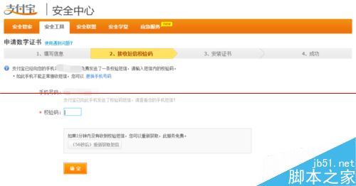 7、打開手機短信,將校驗碼輸入到輸入框內,點擊【確定】,此時進入數字證書安裝界面,如下圖所示。