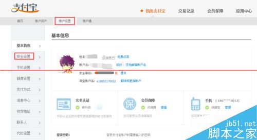 2、點擊上方菜單欄里的【賬戶設置】,進入支付寶個人賬戶界面,如下圖所示。