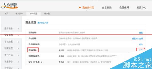 3、點擊左側菜單欄里的【安全設置】,進入安全設置選項,在設置選項里可以看到【數字證書】選項,如下圖所示。