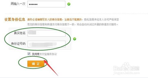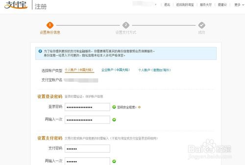 3、進入到支付寶注冊頁面,按照提示設置好登錄密碼及支付密碼,在這里要注意登錄密碼不能和支付密碼相同,支付密碼是將來購物付款的密碼,涉及錢財,要謹記,最后的真實姓名和身份信息也要如實填寫,這個是不能修改的