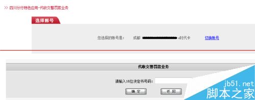 2、選擇“代收交警罰款業(yè)務”,選擇卡號,輸入決定書編號