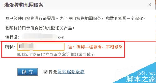 5、登錄地圖后,還需要激活搜狗地圖服務,點擊地圖右上角賬號右邊的【激活】按鈕,輸入【昵稱】后點擊【提交】按鈕,賬號的搜狗地圖服務就激活了,如圖所示: