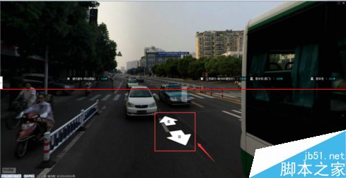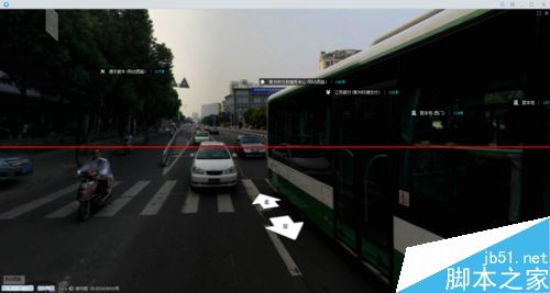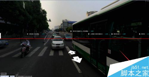 4、點(diǎn)擊藍(lán)色道路后進(jìn)入街景,在街景的右下角有小地圖標(biāo)注你的位置,在街景中可以點(diǎn)擊大箭頭來前進(jìn)和后退,也可以直接在地圖中點(diǎn)擊鼠標(biāo)來前進(jìn),如圖所示: