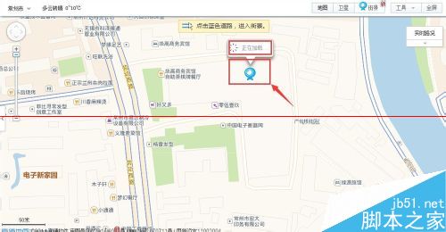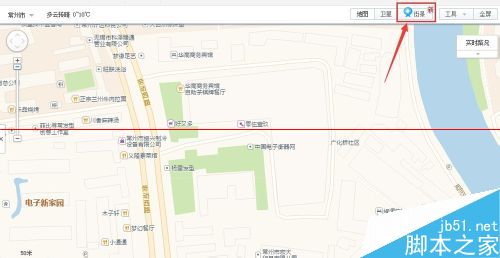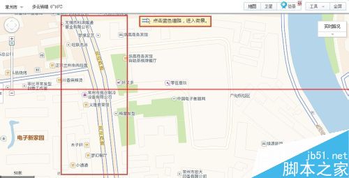 3、在地圖右上角點(diǎn)擊【街景】圖標(biāo),地圖上有街景的道路會(huì)變成藍(lán)色,并提示點(diǎn)擊藍(lán)色道路可以進(jìn)入街景,鼠標(biāo)移動(dòng)到地圖上會(huì)變成攝像頭狀,如圖所示: