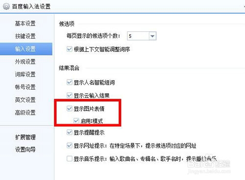 3、在打開的百度輸入法設(shè)置中,選擇”輸入設(shè)置“——勾選”顯示圖片表情“——啟用I模式,如下圖: