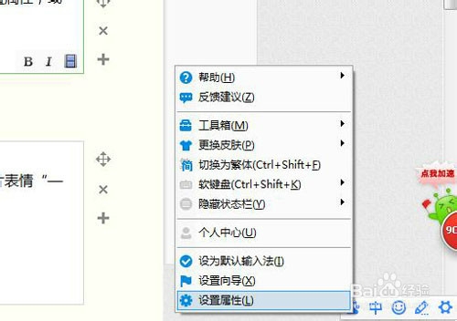 2、安裝好后,在中文狀態(tài)下隨便輸入一個字母,然后選擇右擊——設(shè)置屬性,或是直接百度輸入法中文狀態(tài)欄上右鍵選擇“設(shè)置屬性”,如下圖: