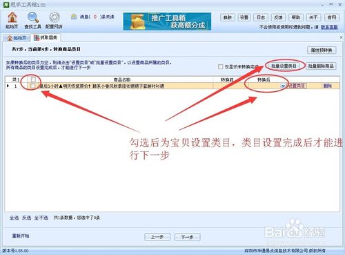 5、勾選所屬類目相同的商品一鍵批量設(shè)置好匹配的類目,再進(jìn)行下一步,轉(zhuǎn)換成功后的類目可顯示在【轉(zhuǎn)換后】下方顯示,注意類目一定要設(shè)置正確