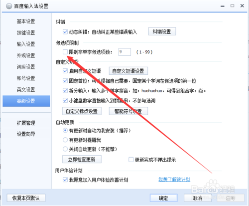 4、在高級(jí)設(shè)置里找到限制非單字候選項(xiàng)數(shù)。