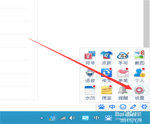1、打開(kāi)網(wǎng)頁(yè),點(diǎn)擊某處能輸入文字的地方,調(diào)整到百度輸入法,屏幕右下角就會(huì)出現(xiàn)百度輸入法的條,點(diǎn)擊最右側(cè)的設(shè)置按鈕。