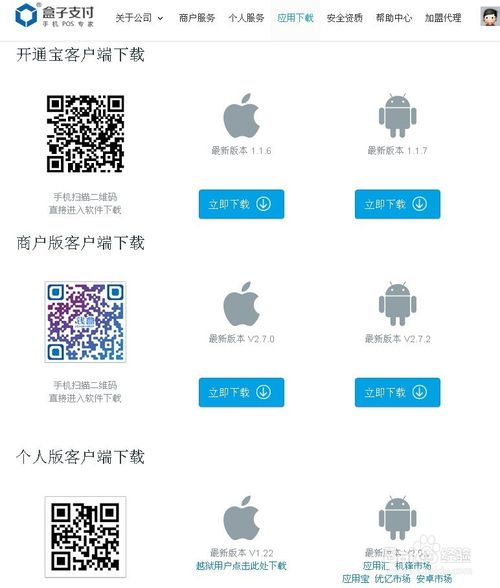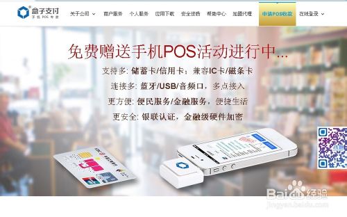 1、首先,百度 盒子支付,打開盒子支付的網站后,看到中間切換的廣告,等到如下的界面,點擊”免費領取“,或者直接點擊網頁上方導航欄的"申請POS收款",進入進行申請即可.
