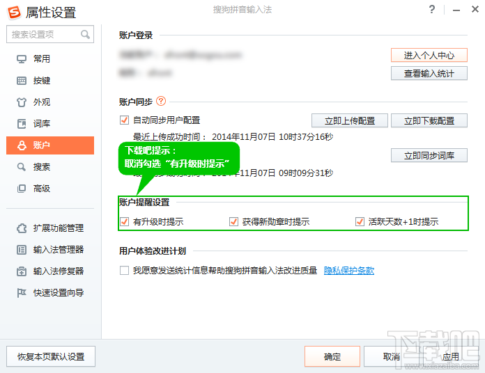 搜狗輸入法在有新版本時會自動彈出一個升級提示窗口,但很多時候一個小版本更新根本不值得我們去更新,如果你又不想忍受升級提示的打擾,就跟下載吧來關閉搜狗輸入法的升級提示吧。