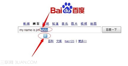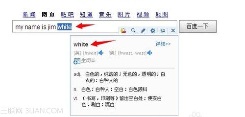 第二步:然后我們打開百度輸入一句英語my name is jim white 我們把一個單詞選中,然后就會看到一個譯字,我們點擊譯字.
