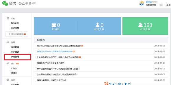一、首先登陸微信公眾平臺,進入微信公眾平臺管理界面后,點擊左側菜單中的“素材管理”,如下示意圖所示:
