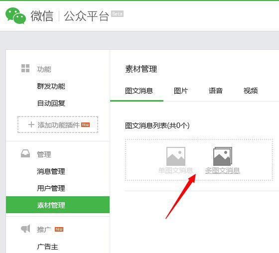 二、之后再點擊“圖文消息列表”下面的+圖標,之后可以選擇“單圖文消息”還是“多圖文消息”,如果所發布的文章只有一張圖片,那么選擇單圖,如果內容中包含多張圖片的話,那就選擇后者,如下圖。