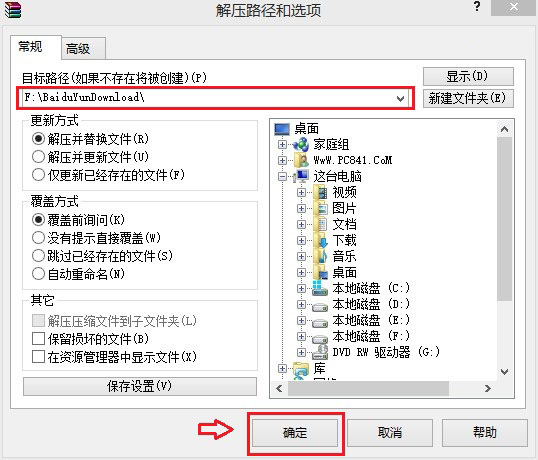 二、然后會彈出一個熟悉的解壓界面,這里主要是可以選擇解壓到哪個文件,默認為當前文件夾,如果需要解壓到其他文件夾,自己選擇一下即可,一般默即可,最后點擊底部的“確認”即可開始解壓分卷文件,如下圖所示: