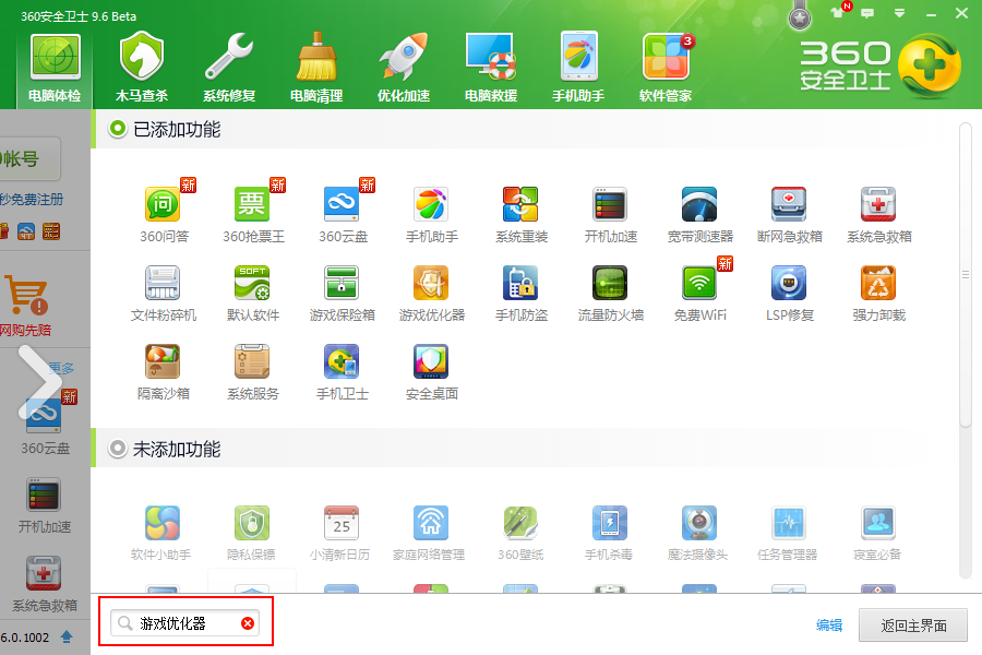 2、進(jìn)入功能大全后在左下角搜索框中輸入游戲優(yōu)化器并搜索這個(gè)功能。