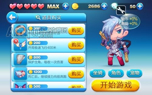 4、正常游戲開始,在玩的過程中當吃到第一個飛行的時候,迅速點暫停,此方法不用買道具,但是手的速度一定要快。