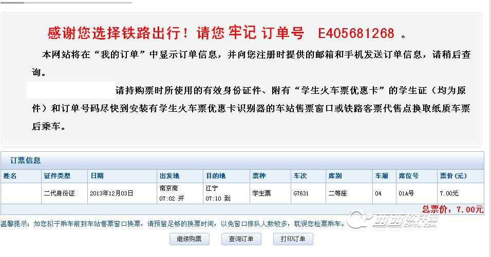 19、緊接著系統會提醒您“請您牢記訂單號E*********”以及相關訂票信息