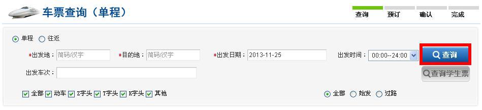 7、進入車票查詢界面,按需選擇“單程”或是“往返”、“出發地”、“目的地”、“出發日期”、“出發時間”,最后點擊“查詢”按鈕