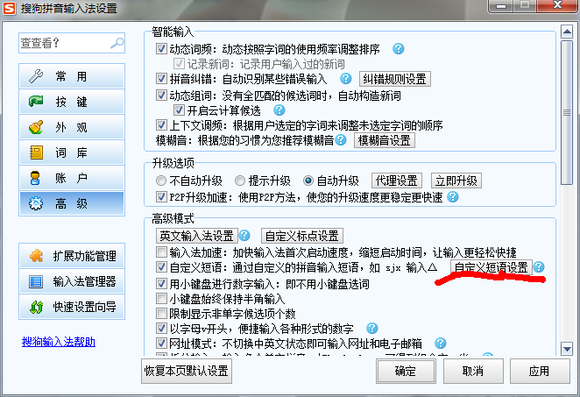 就會(huì)跳出這么一個(gè)框,點(diǎn)擊高級(jí)里面的自定義短語設(shè)置