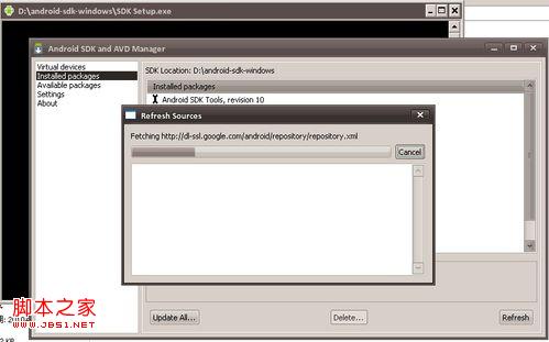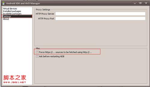如果你看到一條關于SSL的錯誤信息,點擊【Settings】標簽(在SDK and AVD Manager窗口左邊)。然后把Force https://……前面的勾去掉,點確定。
