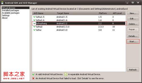 選中你創建的模擬器,然后點擊【Start】運行它。比如我這里來運行2.2版本的。