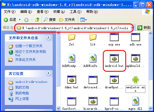 4、接下來依次進入sdk文件夾,找到tools文件夾,里面有很多文件,我們可以看到emulator.exe那個綠色機器人的圖標,但是現在新版SDK中雙擊是無法運行的,我們提供一個簡單的方法來創建一個模擬器,雙擊 android.bat 文件如圖(如果用戶到這一步無法繼續是因為沒有安裝JRE,可以參考Android 1.5 AVD創建答疑一文使用另一種方法創建):