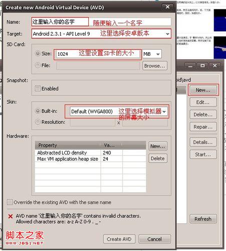 我演示一下創建一個模擬器,先點擊右側的【NEW】按鈕,表情新建一個模擬器,然后在如下設置參數。在Name里輸入你模擬器的名字,最好用英文或數字。在 Target中選擇安卓系統的版本,你下載了哪些版本的,這里就可以選擇哪些版本。在Size里設置SD卡的大小,SD卡就相當于手機中插的內存卡,可以 把各種文件和程序放進去,它是個鏡像文件,比如我這里設置的1G,即1024M。在Built-in中選擇模擬器的屏幕大小,大家最好選擇第一個選項,也 就是前面帶有Default的默認選項。最后點擊最下方的【Create AVD】按鈕完成創建模擬器,因為我這里輸入的Name不對,所以點擊不了。