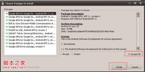 我這里幾乎都下載完了,所以全部是綠色的勾,如果是問號,不用管它,選中右邊的【Accept All】,并單擊【Install】按鈕,就會自動下載并安裝。